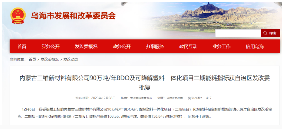 on december 8, the official website of wuhai municipal development and reform commission announced that inner mongolia sanwei new materials co., ltd., a holding subsidiary of sanwei co., ltd., has a 900,000 tons/year bdo and degradable plastic integrated project (ii the request for instructions on measures to resolve the impact of the energy consumption intensity of the 700,000-ton project in the second phase has been reviewed by the autonomous region development and reform commission, and the energy consumption reduction measures for the second-phase project have been clarified (the design energy consumption of the second phase is equivalent to 1.0355 million tons of standard coal, with an equivalent value of 1.3684 million tons of standard coal) ) and agreed to start construction.