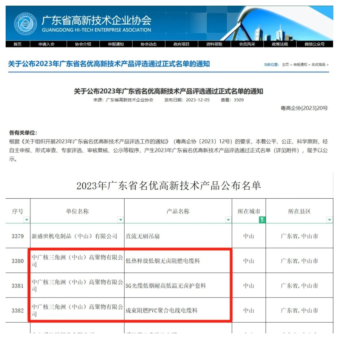 recently, the guangdong high-tech enterprises association announced the “official list of famous high-tech products in guangdong province in 2023.” three products of cgn delta (zhongshan) polymer co., ltd., a subsidiary of cgn high-tech nuclear materials, are on the list, namely low heat release, low smoke, halogen-free flame retardant cable materials, 5g optical cable low smoke, high and low temperature resistant halogen-free sheath materials and bundles flame retardant pvc polymer wire and cable material.