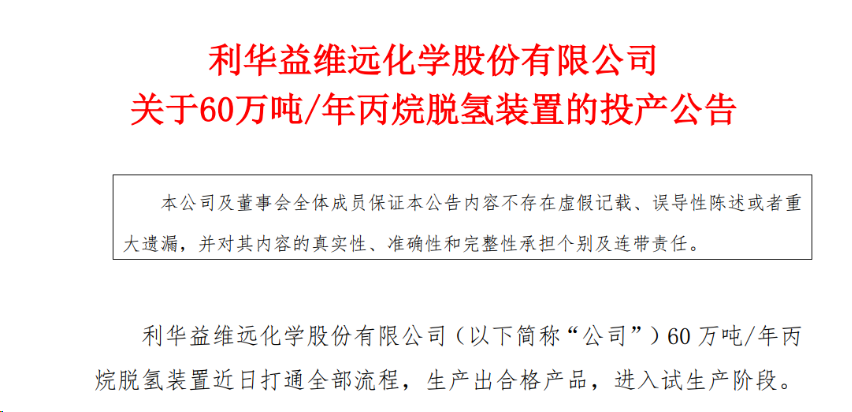 on september 27, donghua energy announced that the first phase (i) of the donghua energy (maoming) propane resources comprehensive utilization project includes a set of propane dehydrogenation units with a design capacity of 600,000 tons/year, and a set of 400,000 tons/year propane dehydrogenation unit. ton/year polypropylene equipment, public works and supporting facilities obtained trial production (use) registration for hazardous chemicals construction projects on september 15, 2023. qualified polypropylene products have been produced and the equipment is operating smoothly.