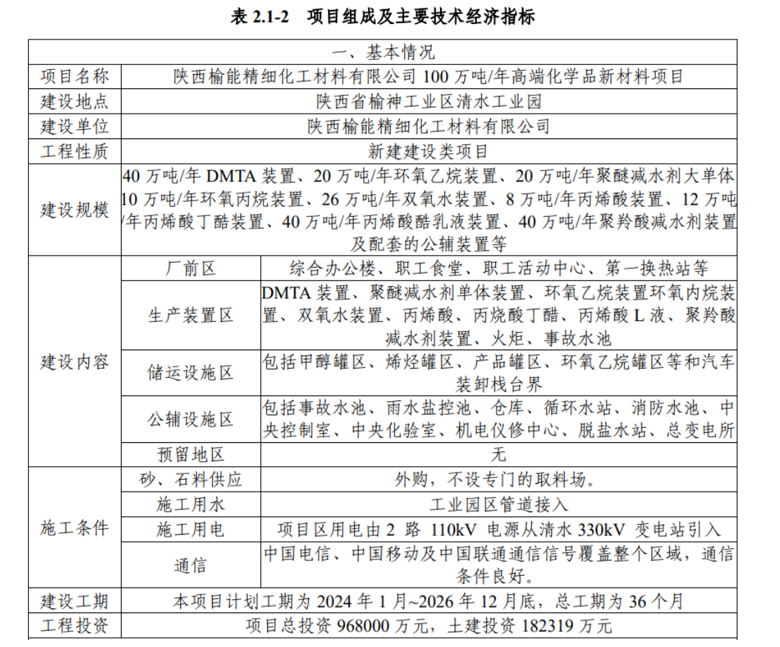 construction scale and content: the project construction content mainly includes a 400,000 tons/year dmta unit, a 200,000 tons/year ethylene oxide unit, a 200,000 tons/year polyether water-reducing agent monomer, and a 100,000 tons/year epoxy unit. propane plant, 260,000 tons/year hydrogen peroxide plant, 80,000 tons/year acrylic acid plant, 120,000 tons/year butyl acrylate plant, 400,000 tons/year acrylic emulsion plant, 400,000 tons/year polycarboxylate water-reducing agent devices and supporting public auxiliary devices, etc.