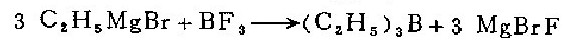 1. in a 1-liter three-necked flask equipped with a mercury-sealed stirrer, reflux cooler, dropping funnel and air guide, put 72 grams (3.0 grams atoms) of magnesium chips and 250 ml of anhydrous water. butyl ether. under nitrogen protection, slowly add 500 ml of anhydrous butyl ether solution containing 327 g (3.0 mol) of ethane to prepare grignard reagent. the reaction started very violently, so the flask must be immersed in a cold water bath to cool, and then 400 ml of butyl ether solution containing 61 g (0.9 mol) boron trifluoride was added dropwise within 4 hours. afterwards, heat at 70°c for 2 hours. (after the reaction is completed, replace the condenser with a ground glass stopper, and the unsealed stirrer with a short fractionator. . such changes to the device should be carried out quickly with a rapid nitrogen flow to avoid exposure of the mixture to air). directly distill the reaction mixture and collect the fractions at 94—97°c to obtain 65 grams (74%) of crude triethylboron.