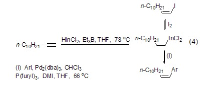 triethylboron can also be used in the hydroindiumation reaction of alkynes and alkenes (formula 4)[3]. the alkenyl indium produced by the reaction can undergo a one-step cross-coupling reaction with halogenated aromatic hydrocarbons or other electrophiles.