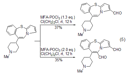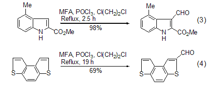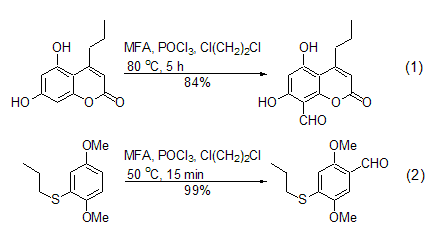 vilsmeier-haak using mfa the selectivity of the reaction mainly comes from two aspects. when the reaction substrate contains multiple aromatic rings, using a limited amount of mfa can make the formylation reaction preferentially proceed on the most reactive ring (formula 5)[11]. when the reaction substrate contains multiple identical reaction sites, using an excess of mfa can cause formylation reactions to occur simultaneously at these sites to generate polyformyl compounds [12].