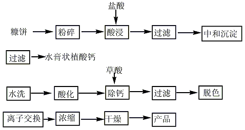 (2) soak the broken rice bran in dilute hydrochloric acid with a ph value of 2 at 50-60°c for 4-6 hours. after filtering, soak the filter residue for another 2 hours, and filter the discarded residue; combine the two filtrates. let it stand for 10 hours, and absorb the supernatant; add an appropriate amount of ca(oh)2 and mg(oh)2 to the clear solution, and use naoh solution to adjust the ph value from 3.4 to 7.0. stir for 15 minutes and let it stand for 2 to 3 hours; discard the supernatant. the clear liquid is filtered, and the filter residue is washed with an alkali aqueous solution with a ph value of 7.5 and distilled water in sequence to obtain calcium and magnesium phytate salts with a yield of 95% to 98%.