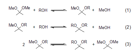 acetal formation through acetalization reaction, different types of acetals can be prepared from 2,2-dimethoxypropane. this reaction process involves the exchange of methoxy or ketone groups in acidic media [1]. there are three equilibrium reactions (formula 1 to formula 3) when 2,2-dimethoxypropane, alcohol and catalytic amounts of acid are mixed. the generated methanol is distilled off, which is beneficial to the acetal reaction. methanol and 2,2-dimethoxypropane form a binary azeotrope, which is destroyed by the addition of an alkane solvent such as hexane or benzene.
