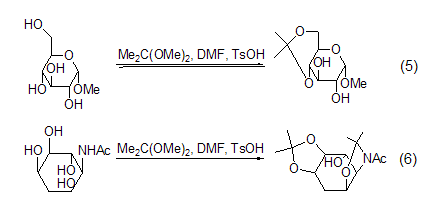 isopropylene derivatives 2,2-dimethoxypropane can be used to protect hydroxyl groups. a mixture of 2,2-dimethoxypropane, dmf and a catalytic amount of p-toluenesulfonic acid is an effective pyruvate ester protector. agent, able to protect the cis-o-diequivalent hydroxyl group. methyl α-d-pyranose reacts under the above conditions to generate methyl 4,6-o-isopropylidene-α-d-pyranose. when deoxyinositolamine is treated with the same mixed reagent, it mainly produces diisopropylidene derivatives (formula 5, formula 6)[3].
