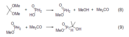 formation of methyl hypophosphite estermethyl hypophosphite can be produced by reacting hypophosphorous acid with 2,2-dimethoxypropane. however, this product will further react with the generated acetone to form methyl 1-hydroxy-1,1-dimethylphosphonite (formula 8, formula 9)[6].