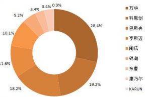 in the next few years, the proposed construction and expansion projects of global mdi manufacturers will mainly focus on asia, north america and europe. by 2024, there will be 11.6 million tons/year of mdi production capacity in the world. figure 1.2024 global mdi supplier capacity structure (unit: percentage) ※ chemical a set of 400,000 tons/year…