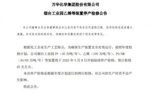 on may 8, chemical announced that according to the characteristics of the production process of chemical enterprises, in order to ensure the safe and effective operation of production equipment, according to the annual maintenance plan, the company’s yantai industrial park pp (30 10,000 tons/year), ethylene (1 million tons/year), po/sm (30/650,000 tons/year) and other devices will…